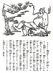 やがて、腰から煙草入れを取り出して先づ一服、煙は爺の鼻の穴から虚空遙かに舞い上がり、