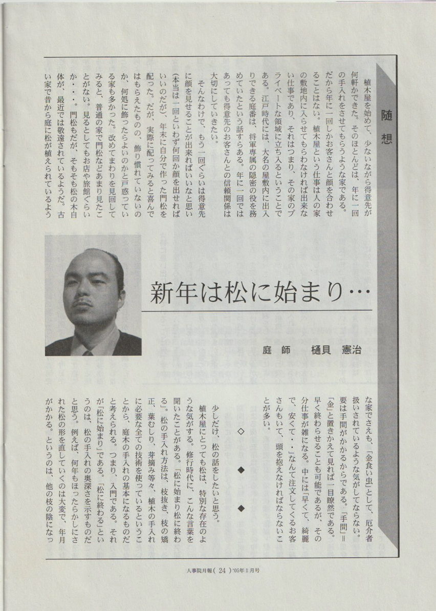 チャキチャキ鋏をならしつつ松の枝を、チョイと散髪しては、離れてためつ、すがめつ眺める、