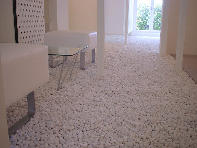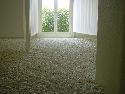 待合い席から眺めると、ちょうど緑がワンポイントとして映える。 室内の床面は白玉砂利を敷き詰め、足裏マッサージ効果をねらう。(談:魚谷) |