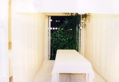 以前のお店の雰囲気は、東南アジア風・・・?南国風だった。今回は、その雰囲気を一掃して一面白を基調とした清潔感漂う内装になった。 白づくしの中そのワンポイントとして、窓の外には緑の壁が見えるようにするという要望があり、このような形になった。 |